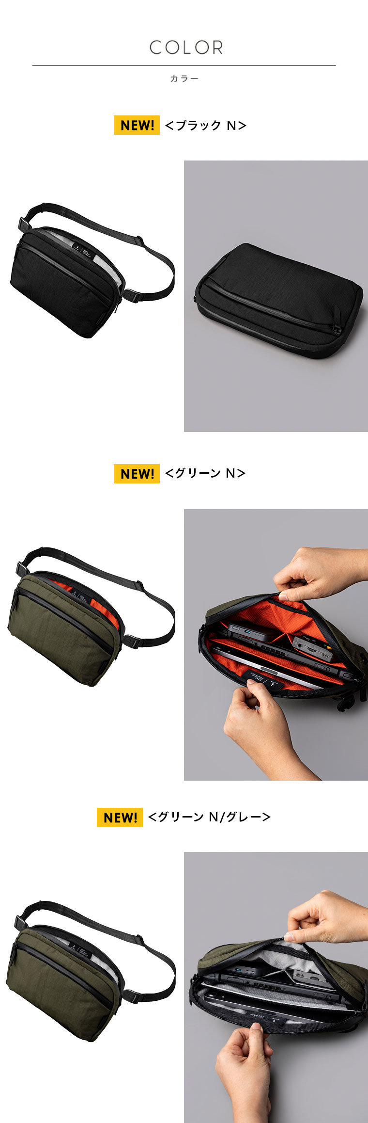 | 仕様 | 前面:ファスナーポケット×1(内側にMODキーテザー×1)、メインコンパートメント:オープンポケット×2、タブレット用ポケット×1、背面:オープンポケット×1 ※BLACK N・GREEN N・GREEN N/GREYは、隠しマグネット開閉式のオープンポケット |