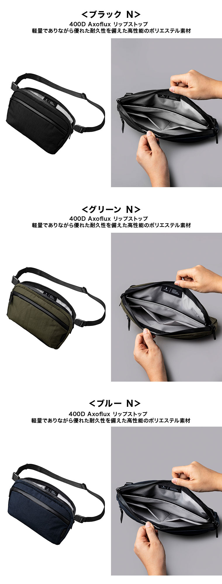 | 素材 | 【ブラック・グリーン】[表地]ナイロン(Axoflux™ 210D リップストップ) 【ブラックN・グリーンN・ブルーN】[表地]ナイロン(Axoflux™ 400D リップストップ) [裏地]ポリエステル(150Dリップストップ) |