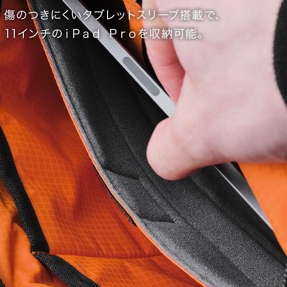 傷のつきにくいタブレットスリーブ搭載で、11インチのiPad Proを収納可能。
