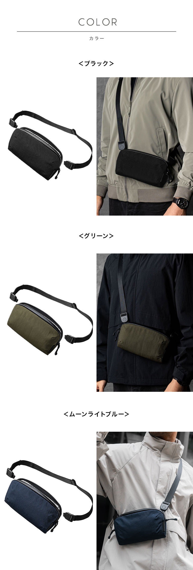 | 仕様 | メインコンパートメント:ファスナーポケット×1、オープンポケット×2、カードポケット×4、背面:マグネット式開閉オープンポケット×1、ショルダーストラップ・リストストラップ付属 |