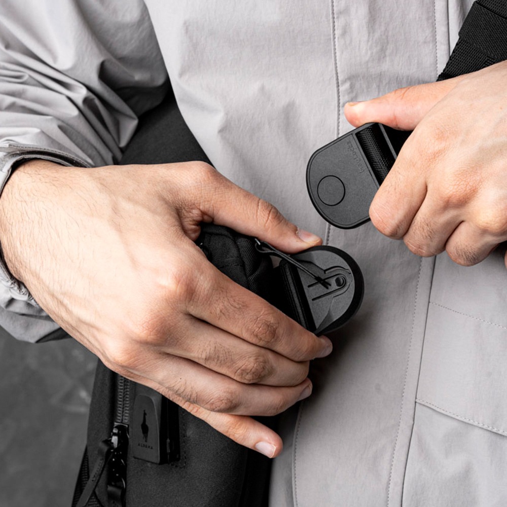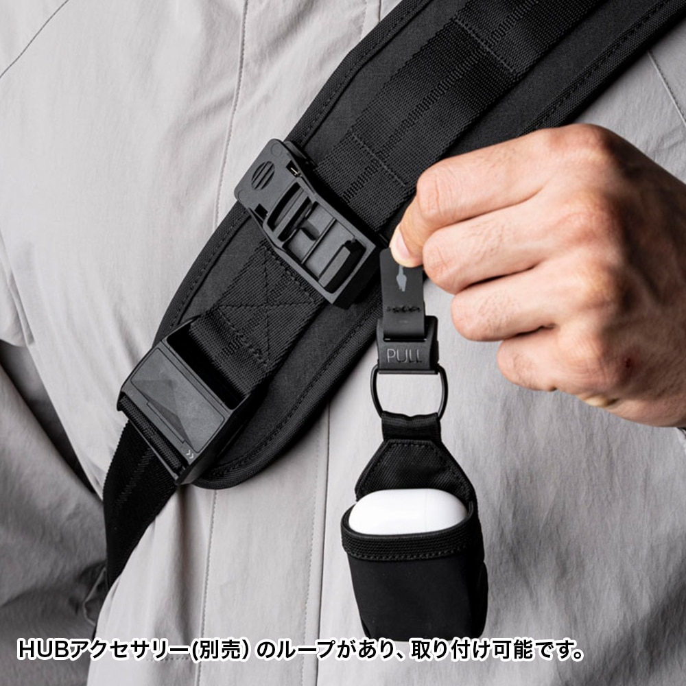 Maglockz buckleで取り外し簡単なパッド入りのショルダーストラップは身体への負担が軽減できます。また、ショルダーベルトパッド上部にはHUBアクセサリー用ループがあり、取り付け可能です。