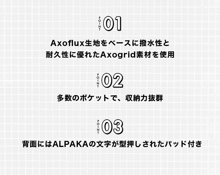 | 素材 | [表地]ポリエステル(Axogrid 300D) [裏地]ポリエステル(200D リップストップ) |