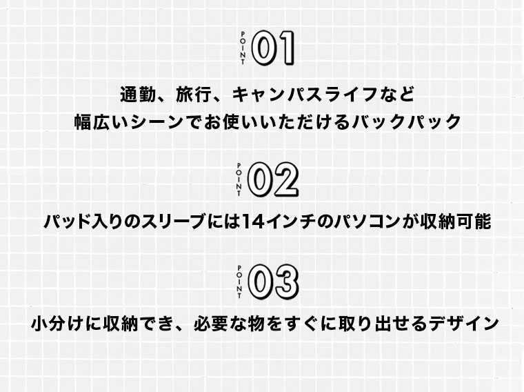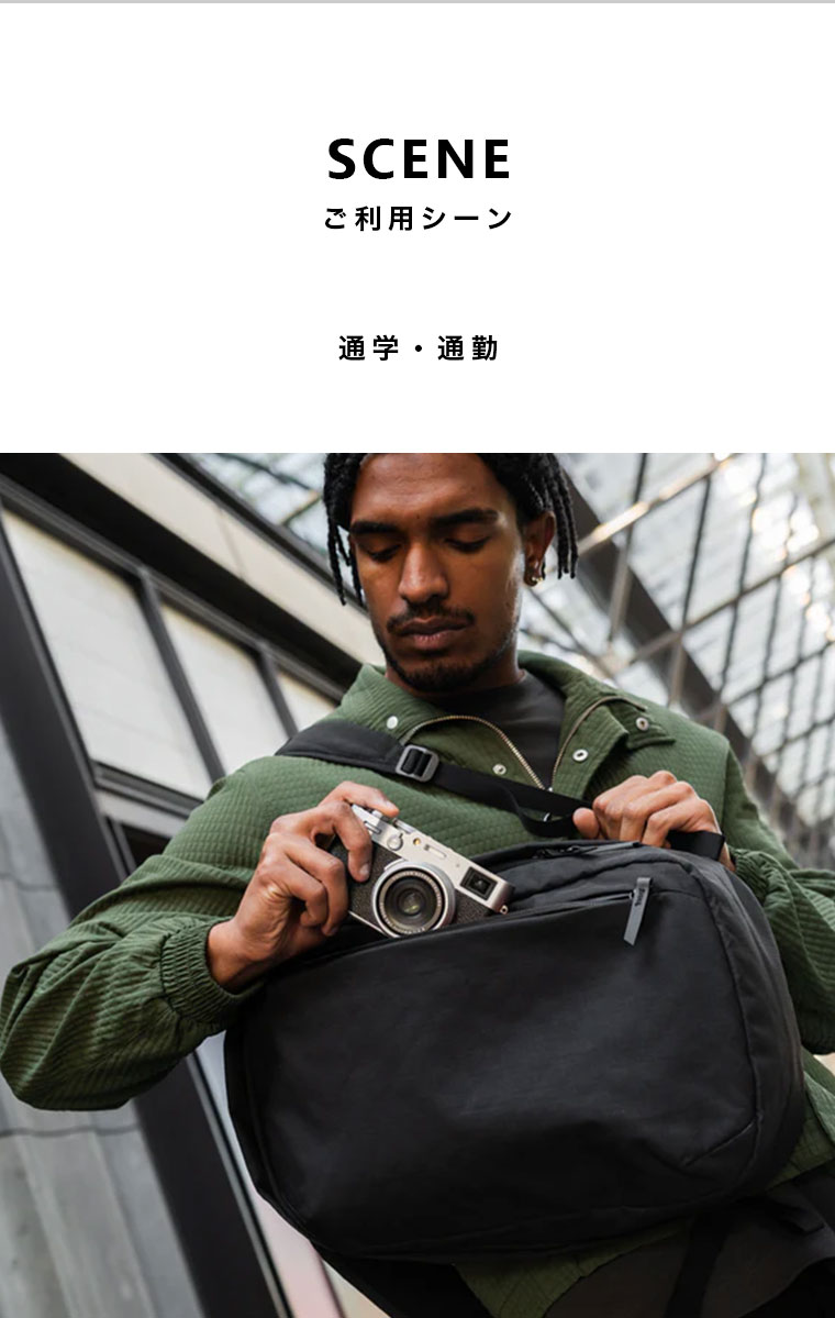 | 毎日の荷物の持ち運びを最大限軽量化することをコンセプトに開発した人間工学に基づいたバックパックです。小分けに収納でき、必要な物をすぐに取り出せる設計。通勤、旅行、キャンパスライフなど幅広いシーンでお使いいただけます。 |