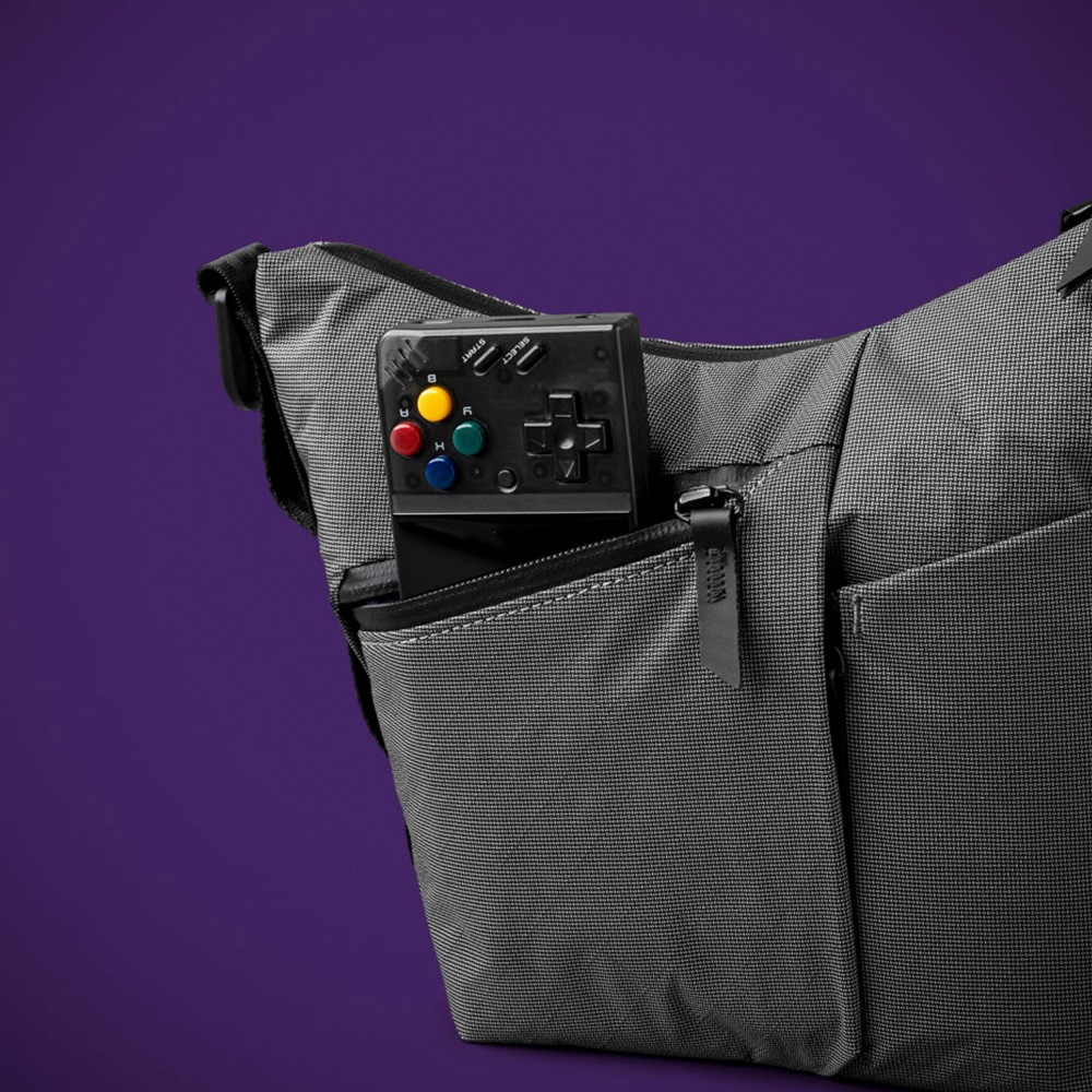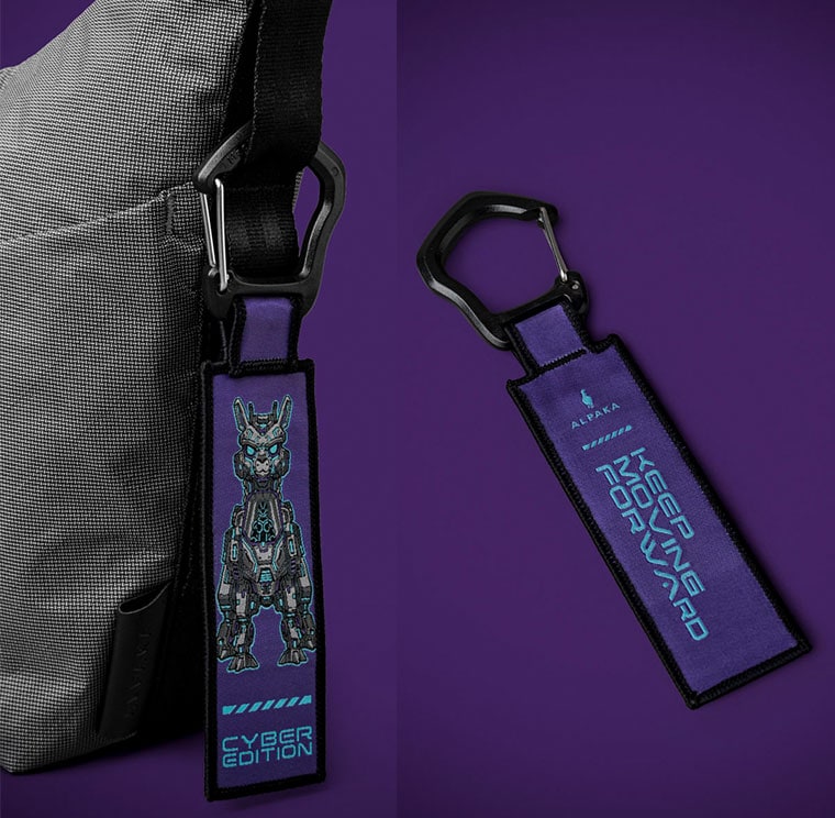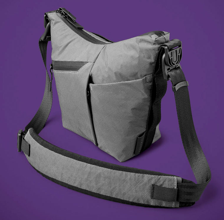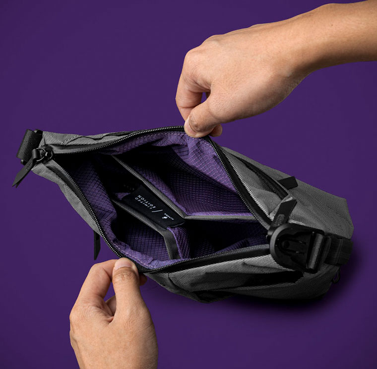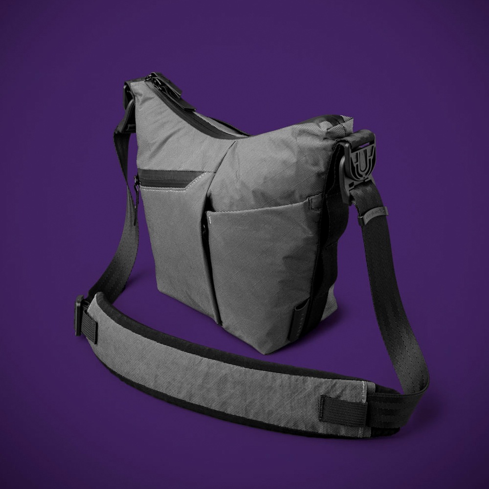 | FLOW SATCHEL2LをベースにグレーのAxogrid生地とビビッドなパープルの裏地、メカをモチーフにしたカラビナ取付のタグ付き。大容量で、より多くの必需品を収納可能。普段使いから旅行など幅広いシーンでお使いいただけます。