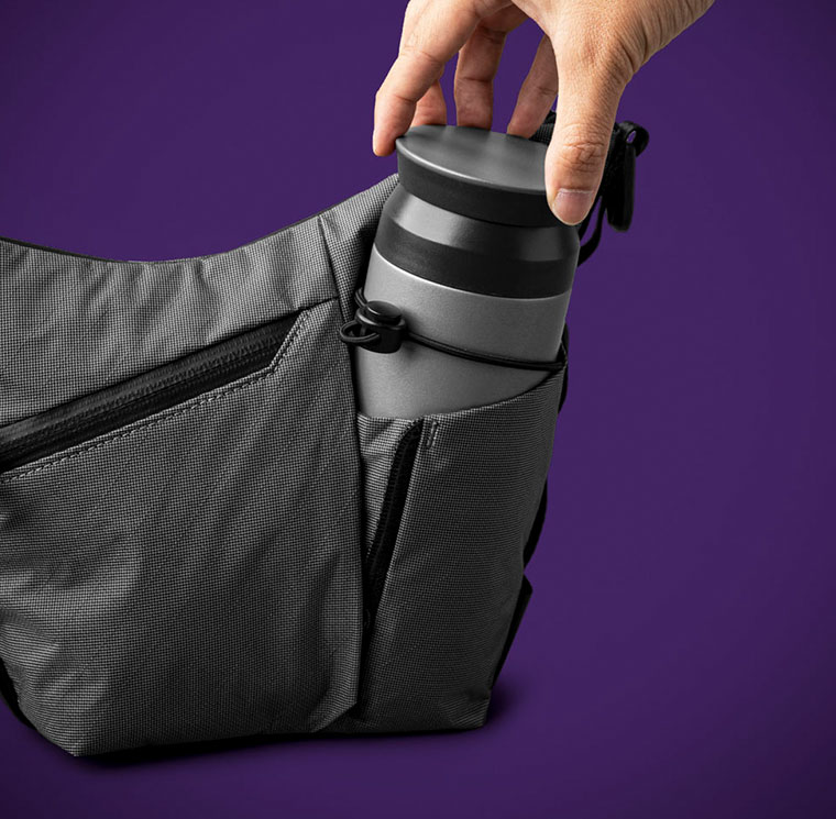 ボトルポケットは拡張式で固定用のゴム付きなので、大きめのタンブラーやペットボトルも持ち運べます。