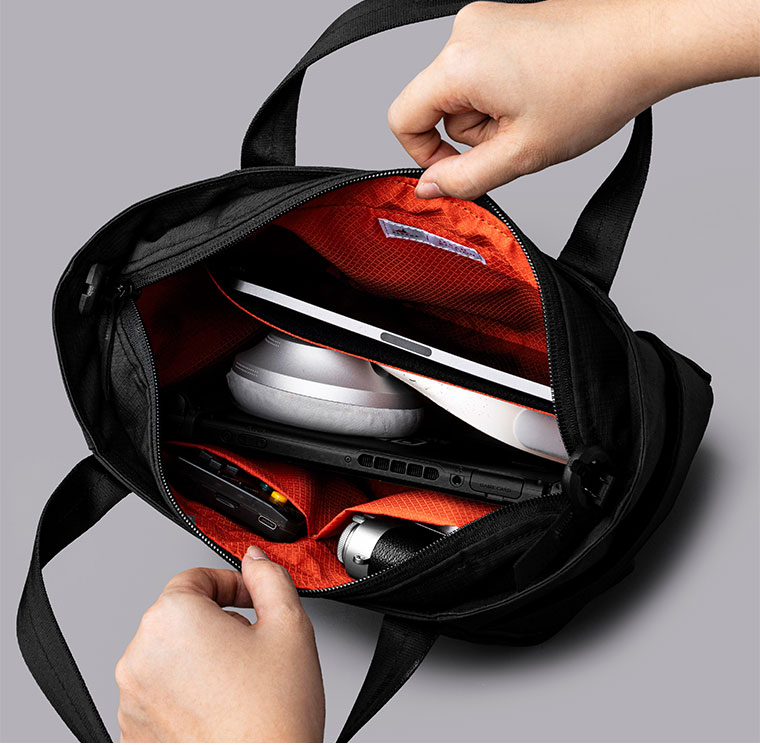 メインコンパートメント内の2つのオープンポケットには仕分けしたい小物を、ソフトタッチのフリース裏地付きタブレットスリーブには、タブレットやゲーム機を収納可能です。