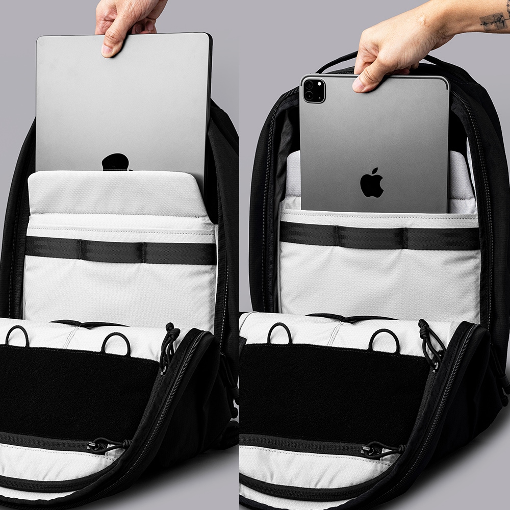 背面収納:パッド入りの16インチ対応のパソコンスリーブと11インチ対応のタブレットスリーブを完備。